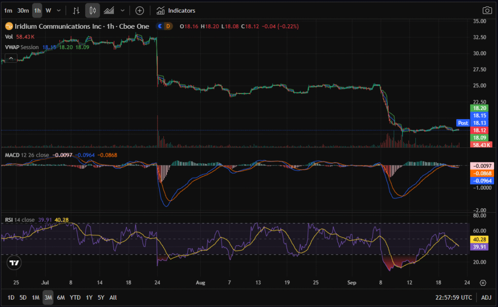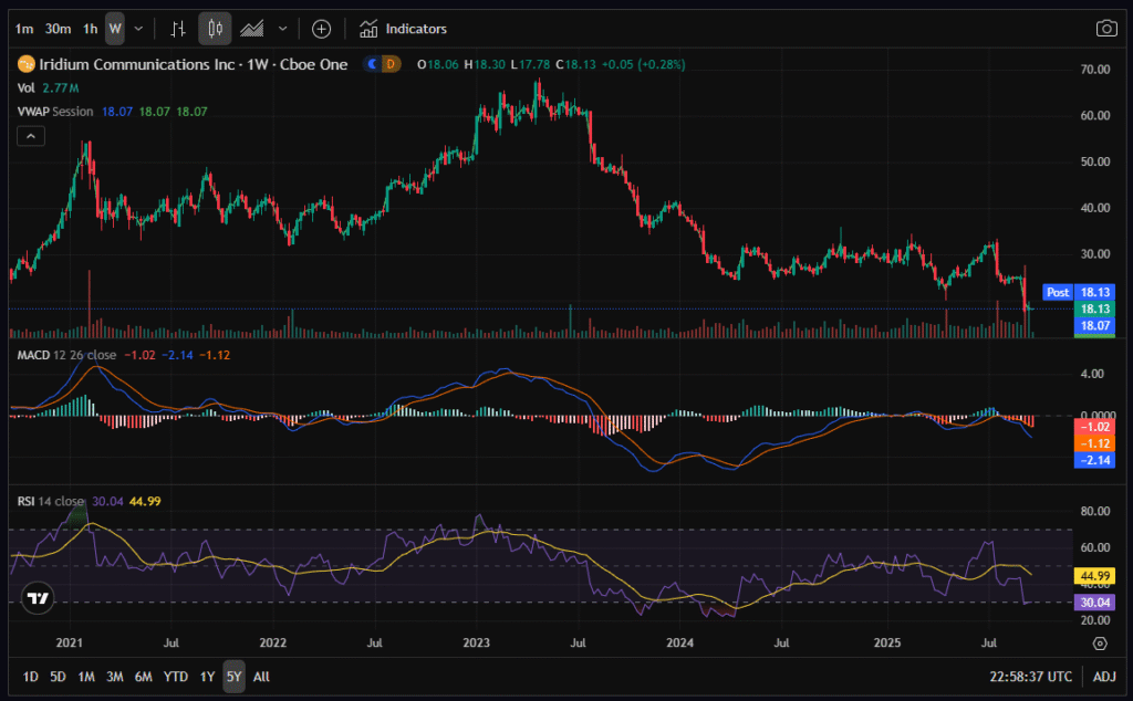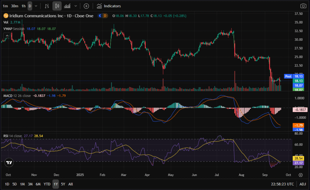 - 1-Year Chart: A decisive break to new 52-week lows, confirmed by a bearish MACD crossover. RSI dipped to ~28, showing oversold conditions. Historically, IRDM has bounced when RSI hits the 20s, but momentum is still negative.