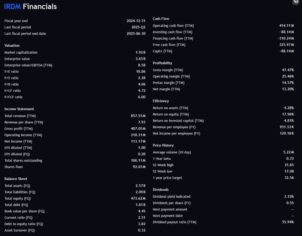- Free Cash Flow: $326M – strong positive FCF gives IRDM breathing room.