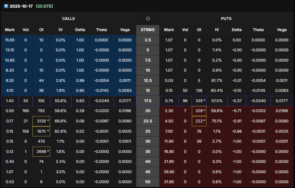 - October (25 DTE): Heavy OI at $22.5C and $25C → speculative bullish bets.