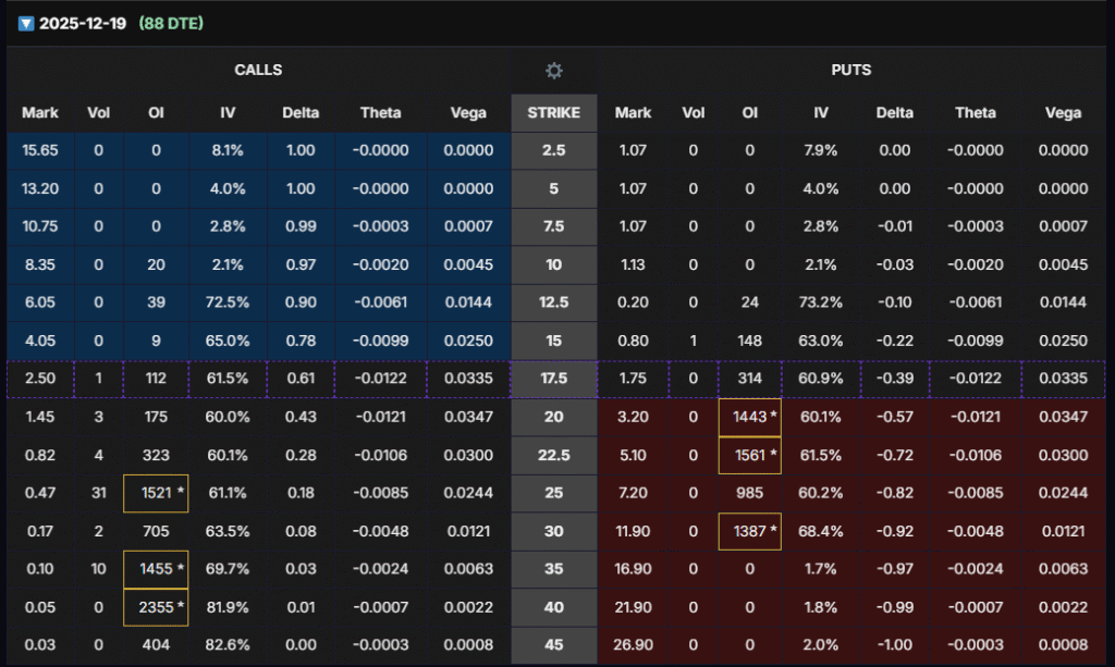 - December (88 DTE): Large OI at $25C, $35C, $40C → medium-term bullish bets.
