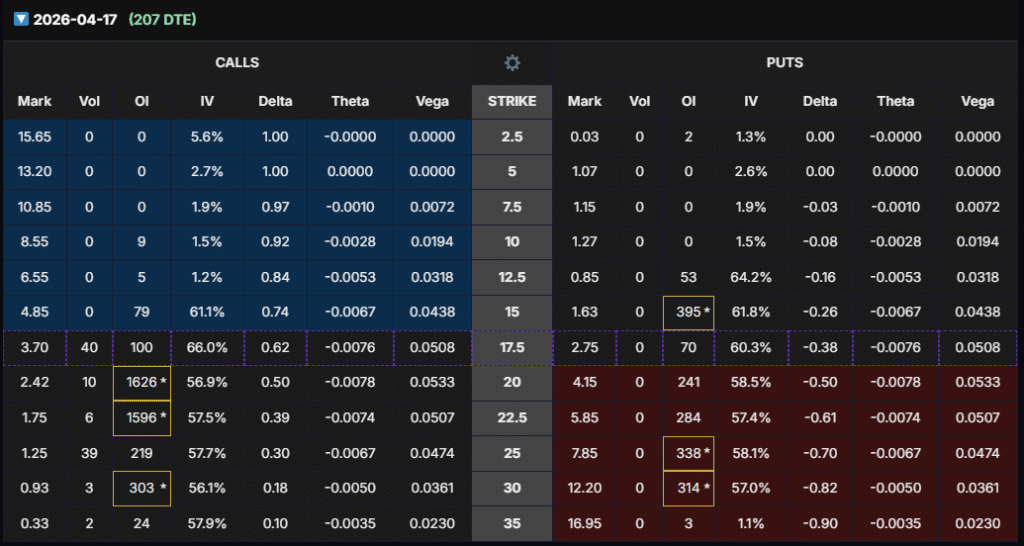 - Selected Contract: $20C (Apr 2026, ~207 DTE).
