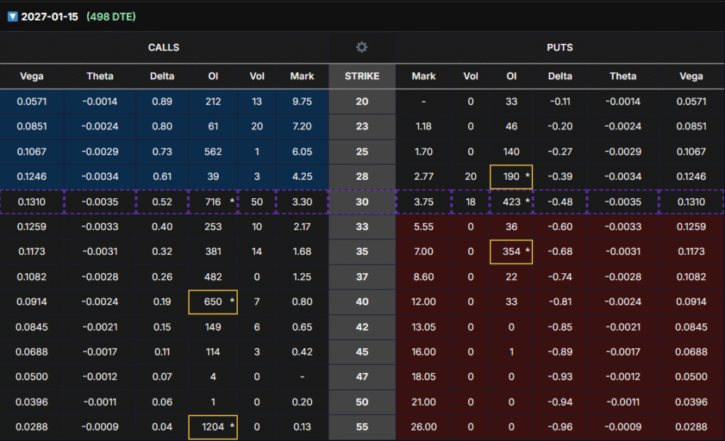 Takeaway: The $30 strike is the stronger candidate — best Delta/Vega balance, liquidity, and positioning at support. The $33 strike is cheaper and more speculative.