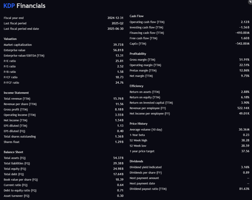Takeaway: KDP is financially solid, generating consistent cash flows and sustaining a reasonable balance sheet. Its profitability isn’t as elite as Coca-Cola, but it is comparable to PepsiCo, making it a strong defensive stock during market volatility.