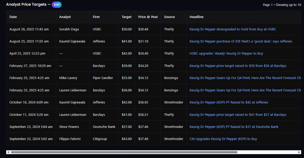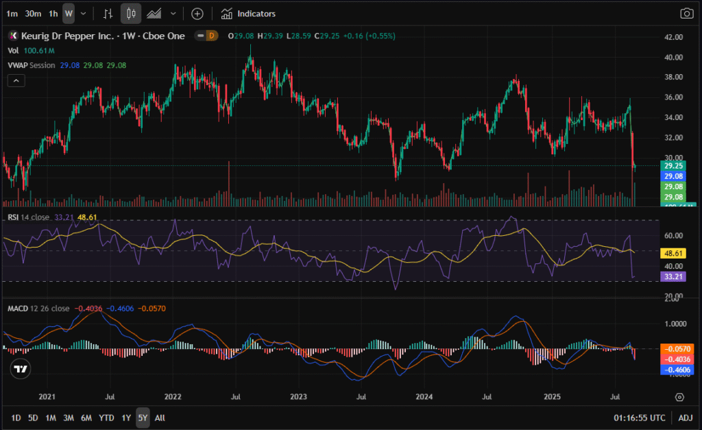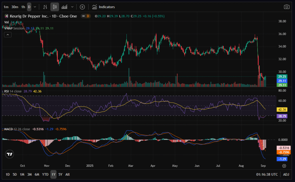 Keurig Dr Pepper (Ticker: KDP) is a consumer staples giant known for its steady revenue, popular beverage brands, and reliable dividend. Yet, despite its defensive profile, the stock has recently taken a significant hit, falling to $29.25, which marks a fresh 1-year low. This selloff has put KDP back into a critical long-term support zone, making it an interesting candidate for options traders who look to profit from volatility and mean reversion.