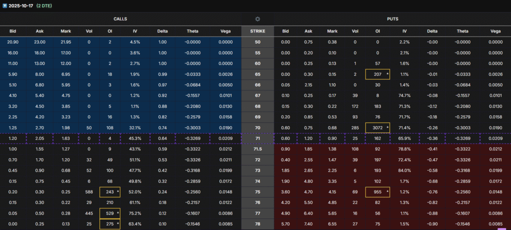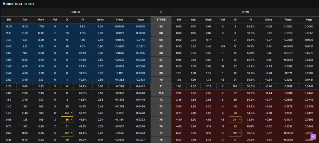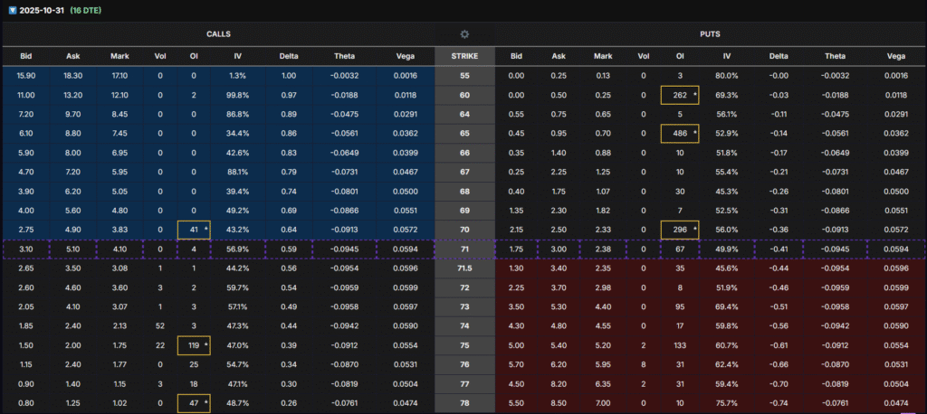 - Oct 31 chain: Put OI high at $65, Call OI rising at $75 → the first bullish rotation.