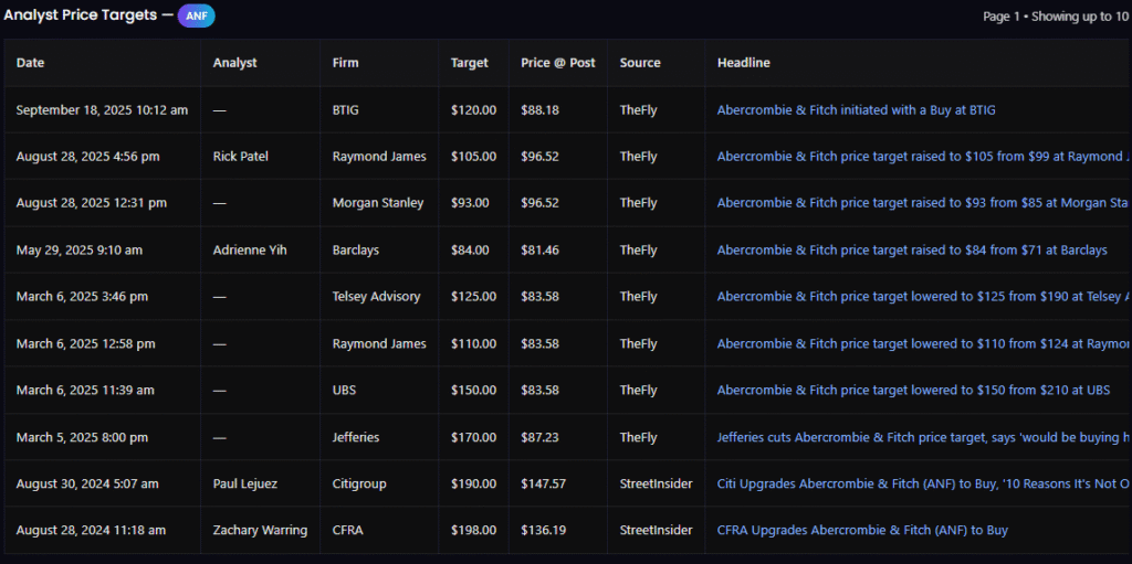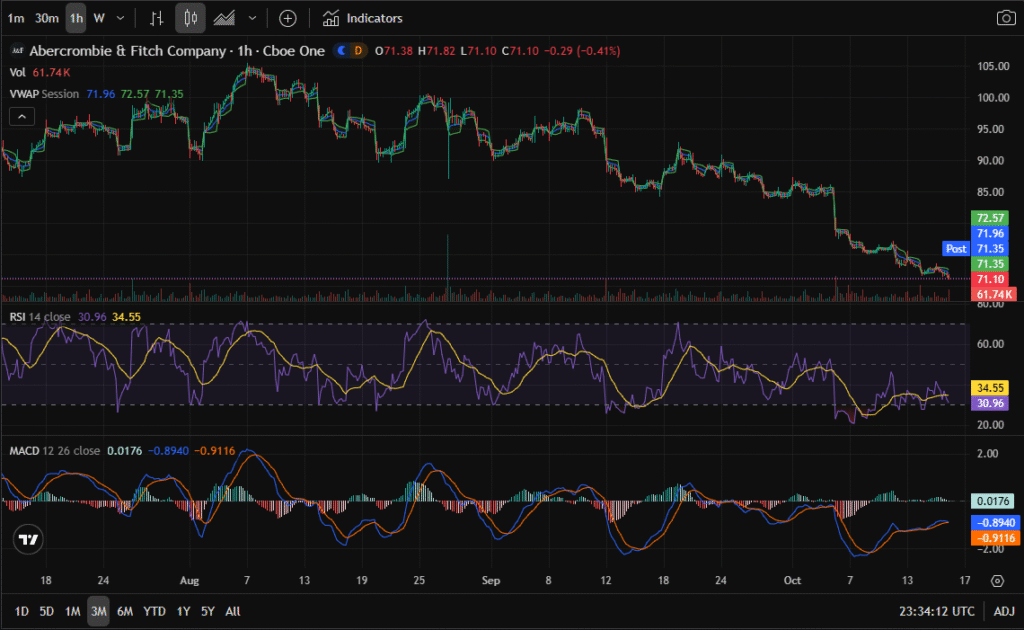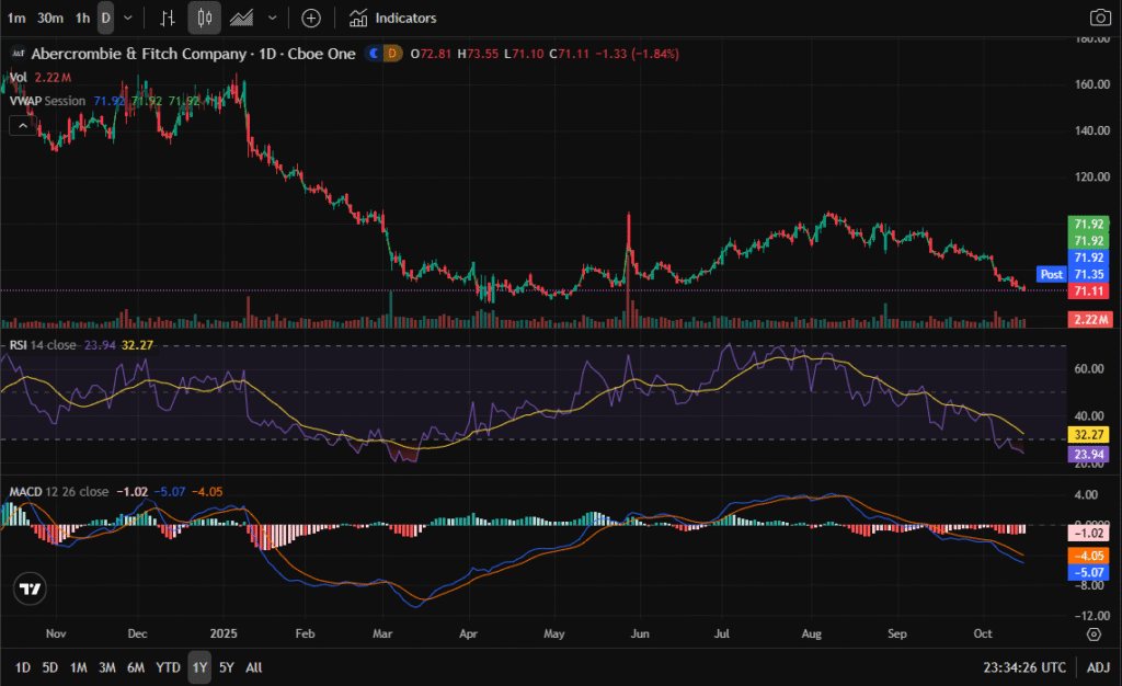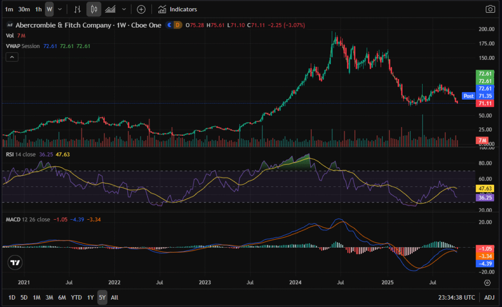Abercrombie & Fitch (NYSE: ANF) has fallen from triple digits to the low $70s, creating one of the most asymmetric setups in months. After a multi-quarter rally that peaked near $190, shares have retraced into strong multi-year support at $68–$72.