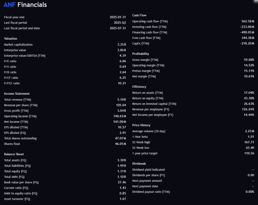 ANF is financially strong, cash-rich, and undervalued. The selloff appears technical rather than fundamental. This sets up ideal conditions for institutional Vega expansion — low IV, solid balance sheet, high FCF yield.