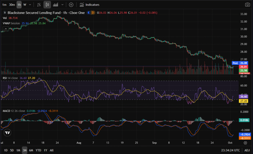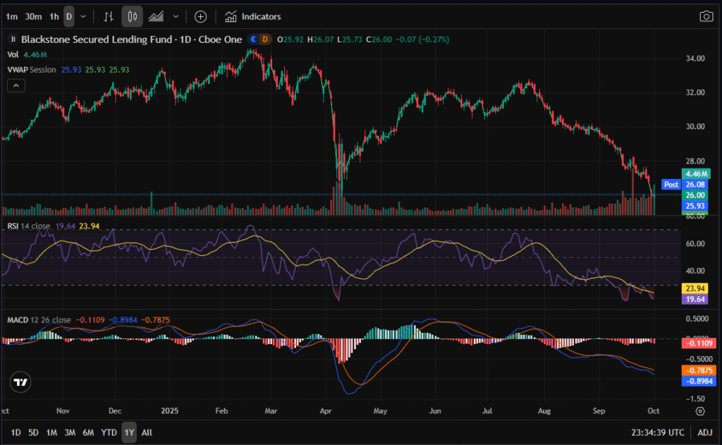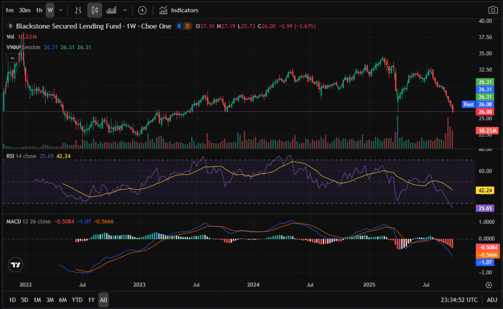 Blackstone Secured Lending Fund (NYSE: BXSL) has entered a critical juncture. After a prolonged downtrend, the stock now trades near multi-year support levels around $25–26, with technicals showing deeply oversold conditions. At the same time, BXSL’s fundamentals remain strong, its dividend yield is elevated, insider activity shows confidence, and options flow suggests institutions are preparing for a rebound.