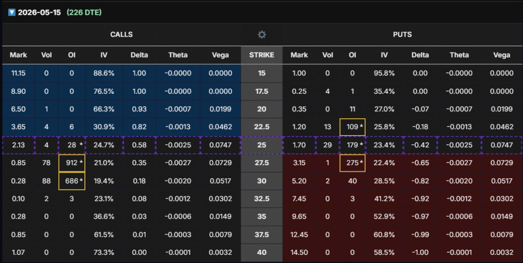 - May 2026 (226 DTE): The $27.5 calls again show the highest liquidity (OI = 912, Delta ~0.35, Vega ~0.073).