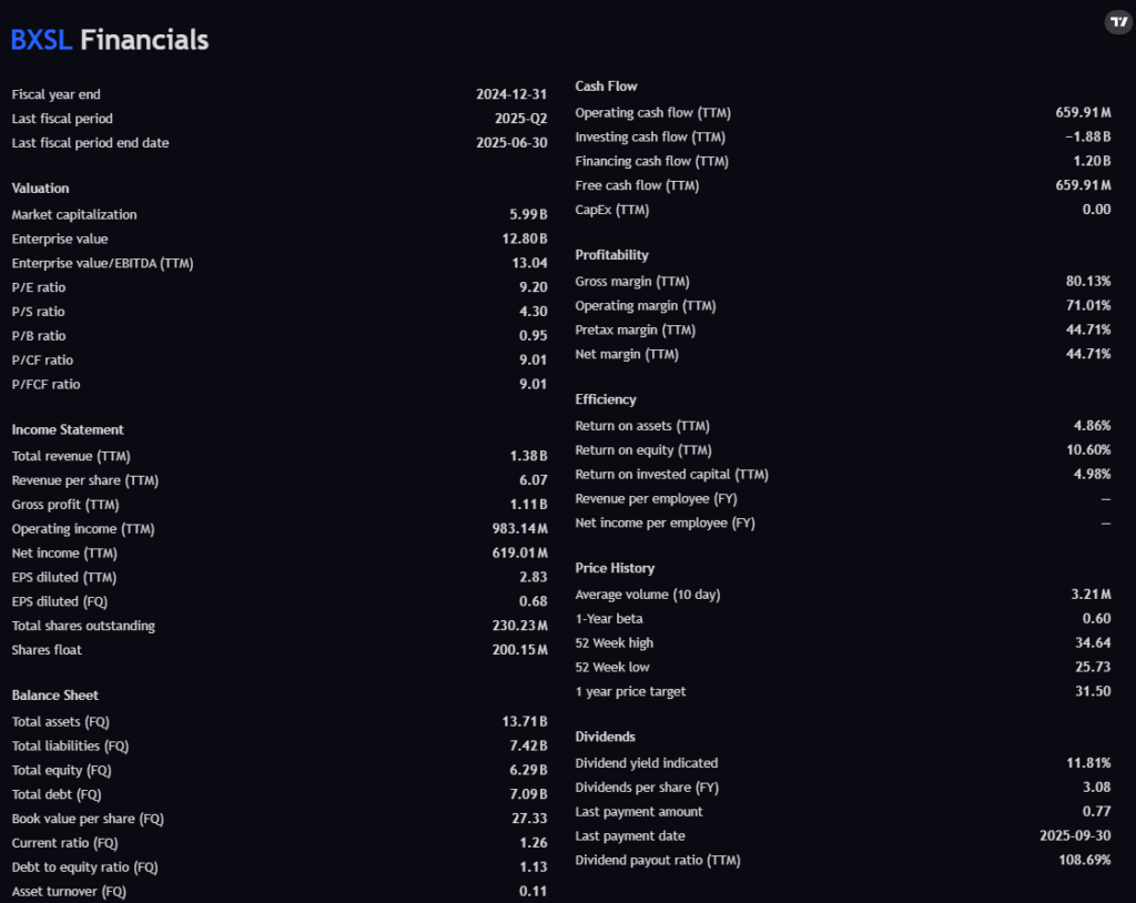 ⚖️ Interpretation: BXSL is fundamentally strong. It generates solid free cash flow, has industry-leading margins, and trades at a discount to NAV. The only red flag is its dividend payout ratio above 100%, raising fears of a potential cut.