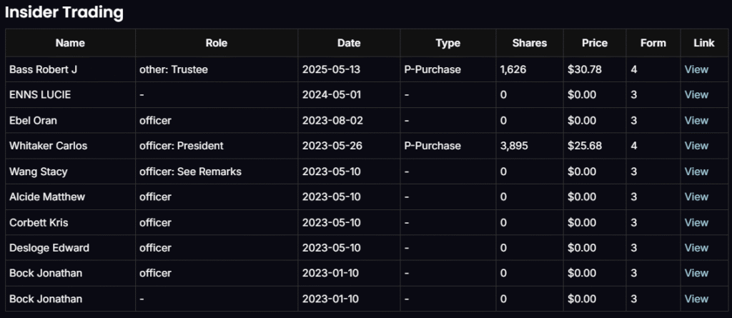- Trustee Robert Bass purchased 1,626 shares at $30.78 (2025).