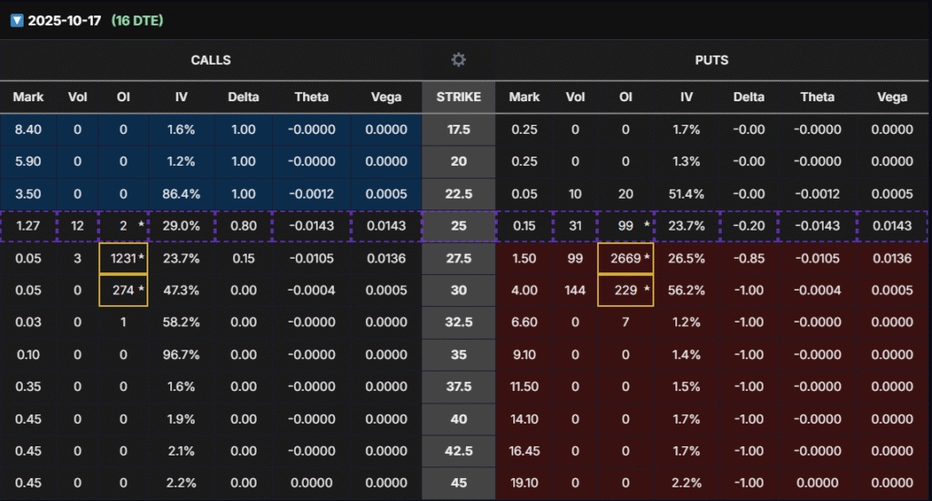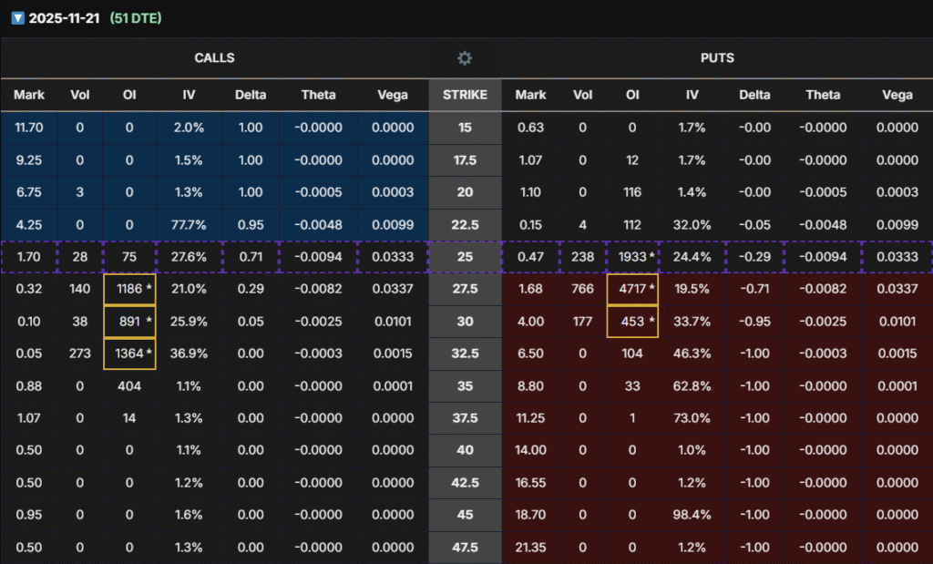 - Near-term (Oct/Nov 2025): Call OI clusters at $27.5, $30, and $32.5 — traders betting on a rebound by year-end.