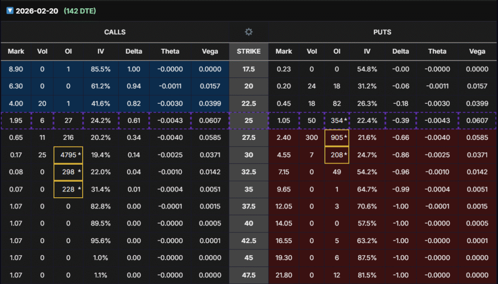 - Medium-term (Feb 2026): Heavy concentration at $27.5 strike (4,795 contracts) — strongly bullish.