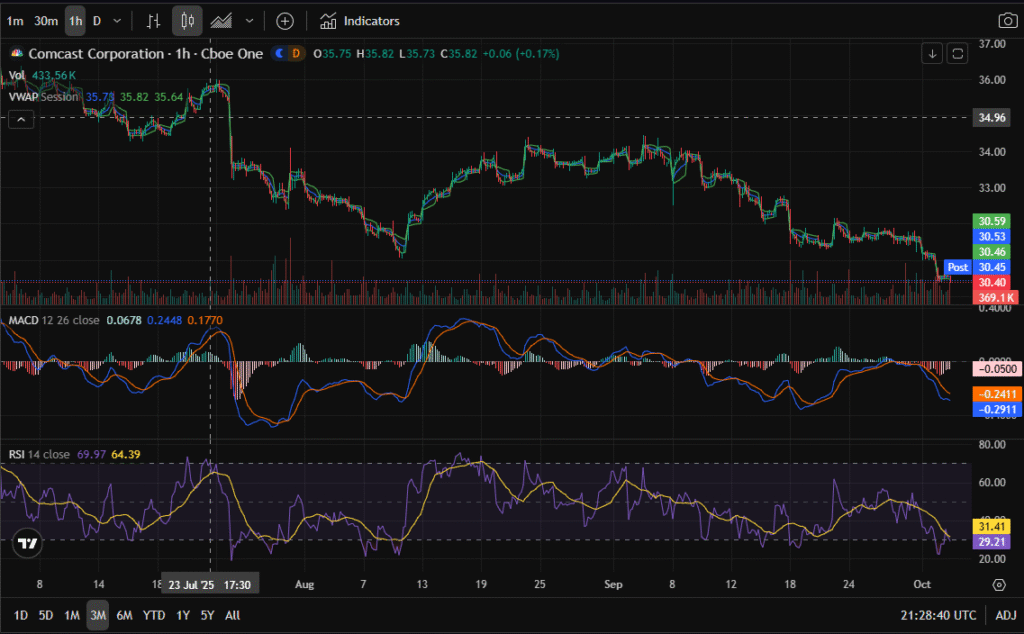 Comcast (CMCSA) has been in a sharp downtrend over the past three months, sliding to new 3-month lows near $30.40. Technical signals are decisively bearish: