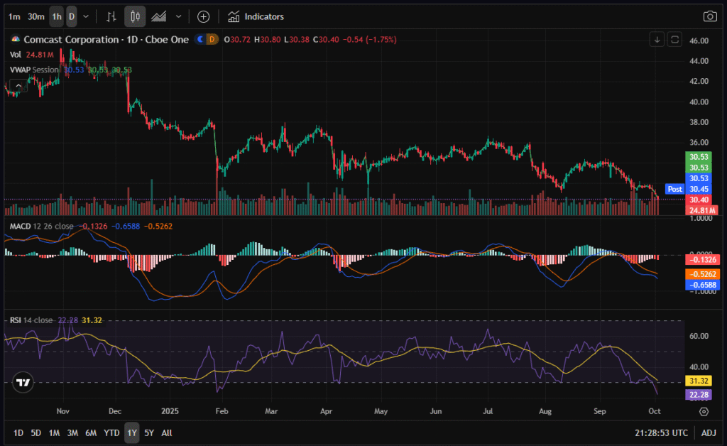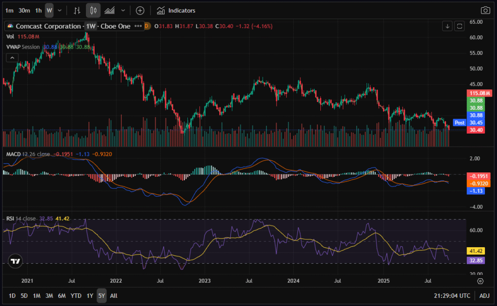 On the five-year chart, CMCSA trades near its lowest levels since the COVID crash, hovering around $30.