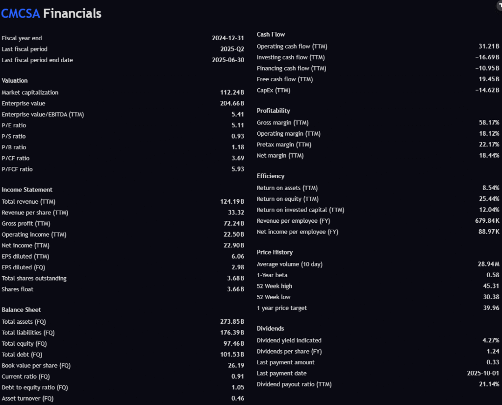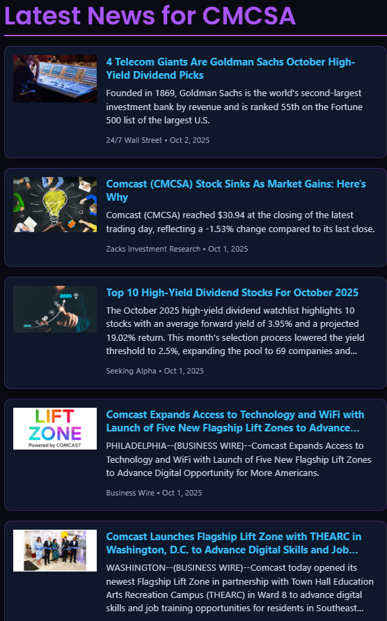 Recent headlines frame CMCSA as a high-yield dividend play, with firms like Goldman Sachs highlighting it in their October picks. Meanwhile, Zacks pointed out that Comcast stock continues to sink even as broader markets rise — a sign of company-specific weakness. On the positive side, Comcast continues expanding Lift Zone initiatives to strengthen its broadband moat.