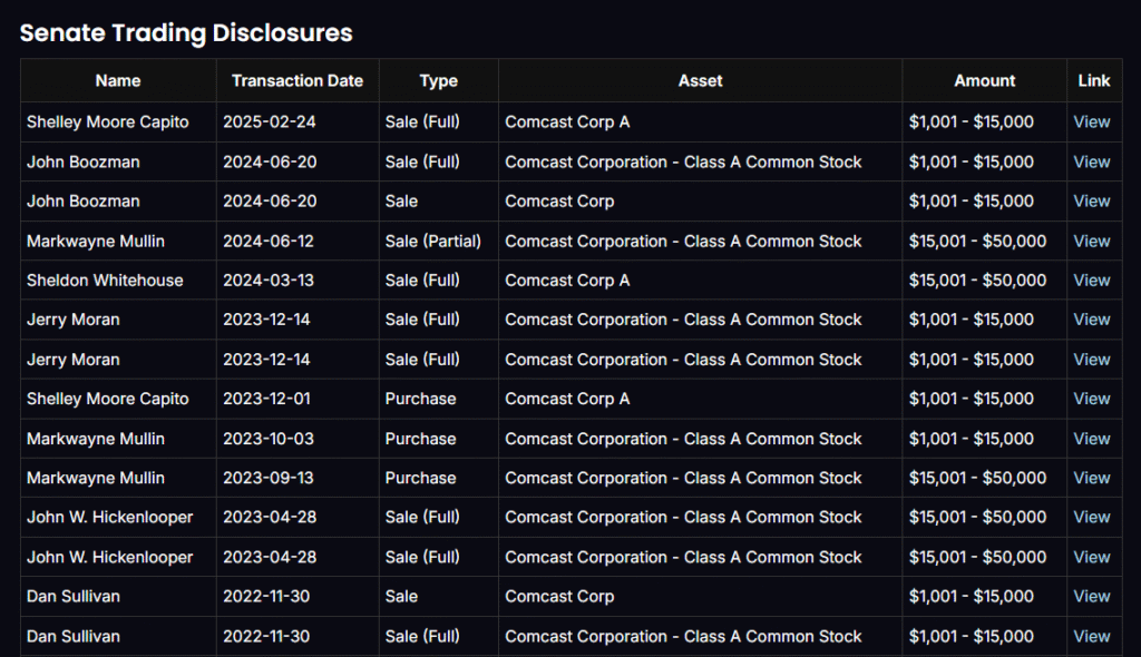 - Senate & House Trades: Predominantly sales in 2024–2025, with a few purchases (Ro Khanna, Markwayne Mullin).