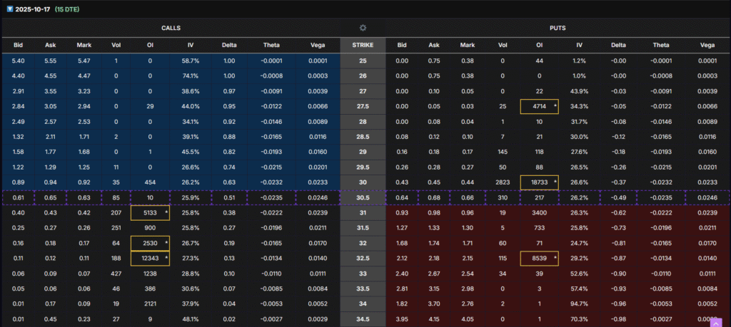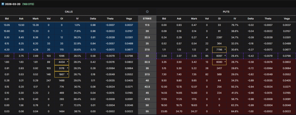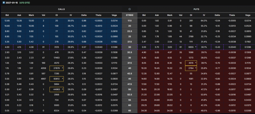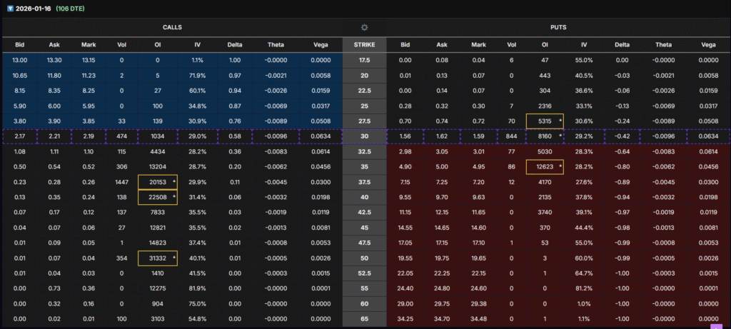 - Jan 2026 $37.5–50 calls carry massive OI (20K–30K contracts)