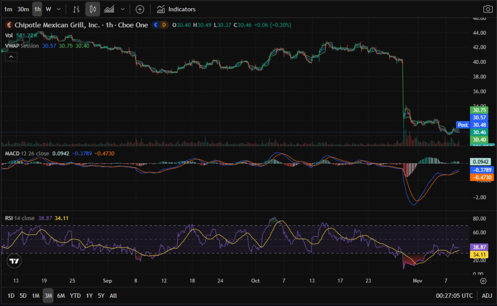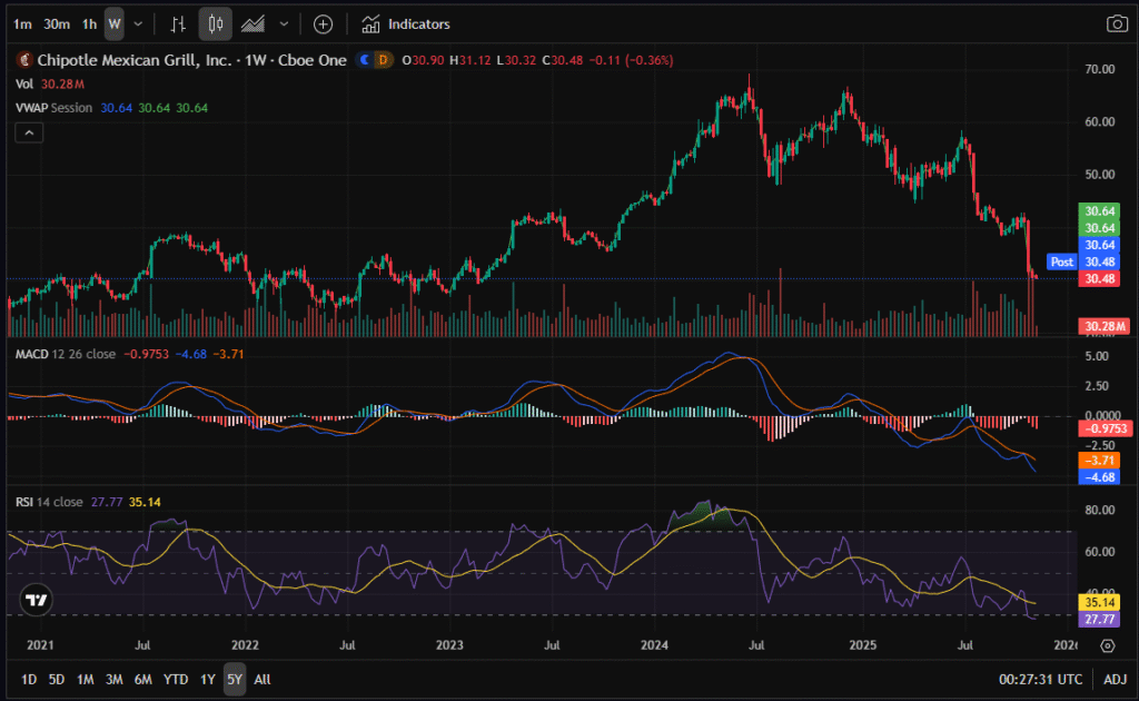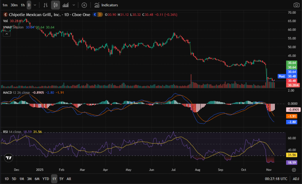 • 3-Month Chart: CMG has printed a steep three-month decline, now forming a potential base near $30.40, a level representing a capitulation low. The MACD recently made a bullish crossover, and the RSI sits near 34, suggesting the short-term selling momentum is fading.