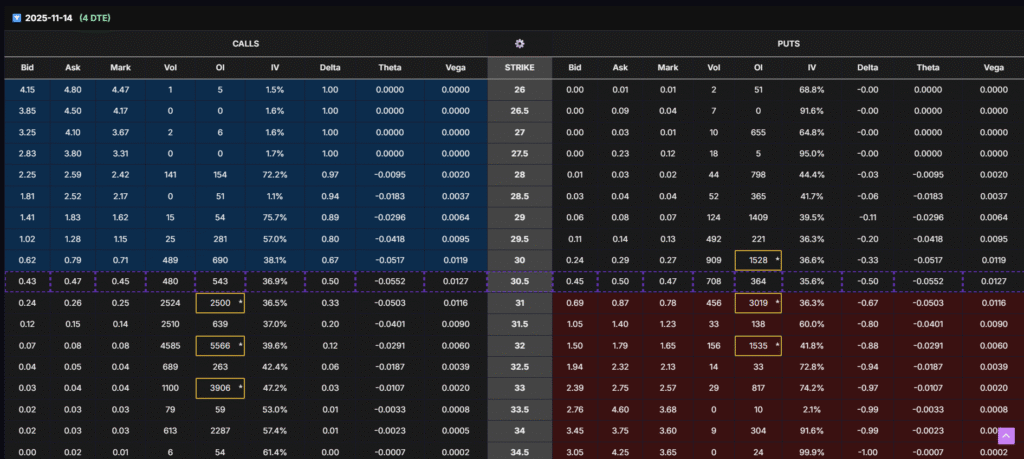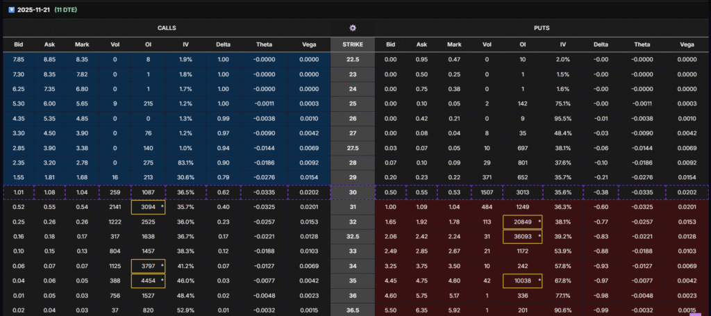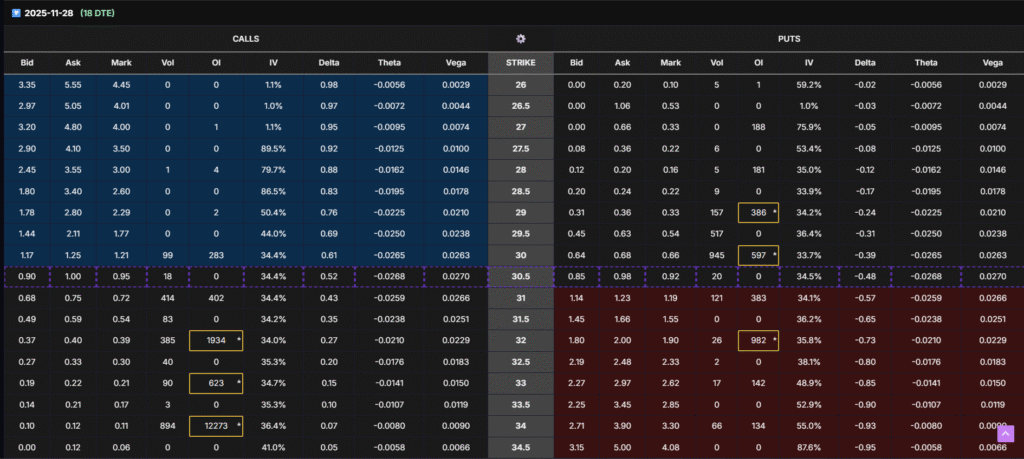 Recent short-term chains (Nov 14–Nov 28 expirations) show significant call-side open interest clustering between $30–$33, especially at the $32 strike (12,000+ OI).