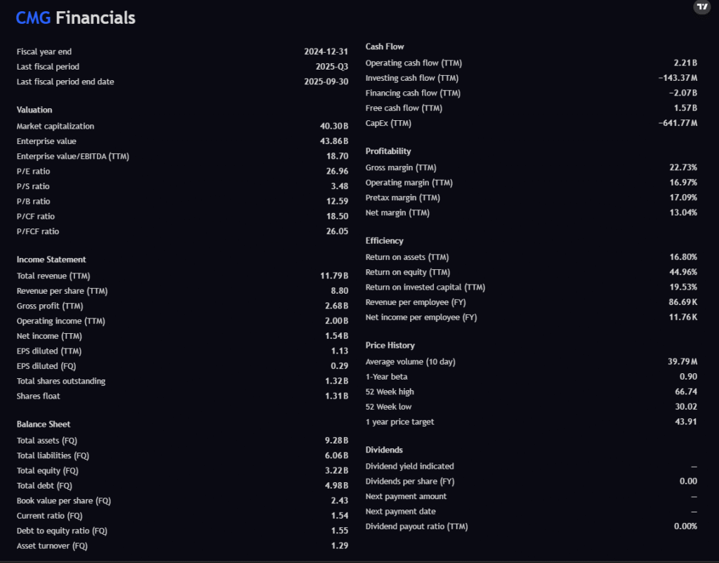 Even after the selloff, CMG maintains elite fundamentals with strong profitability and efficiency. Its debt-to-equity ratio (1.55) is higher than historical norms but still manageable given its free cash generation.