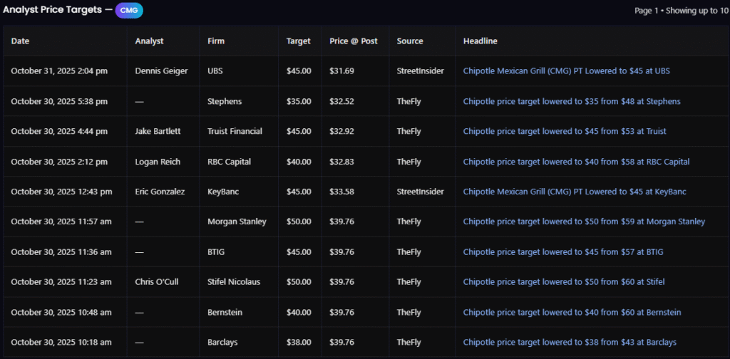 February 4, 2026 1:34 pmBrian HarbourMorgan Stanley$49.00$39.17TheFly Chipotle price target lowered to $49 from $50 at Morgan Stanley
