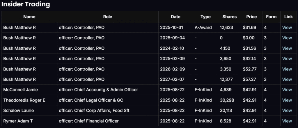 Recent Form 4 filings show no insider selling. Executives such as the CFO and Chief Legal Officer received equity grants at prices near $31–33, demonstrating continued internal confidence.