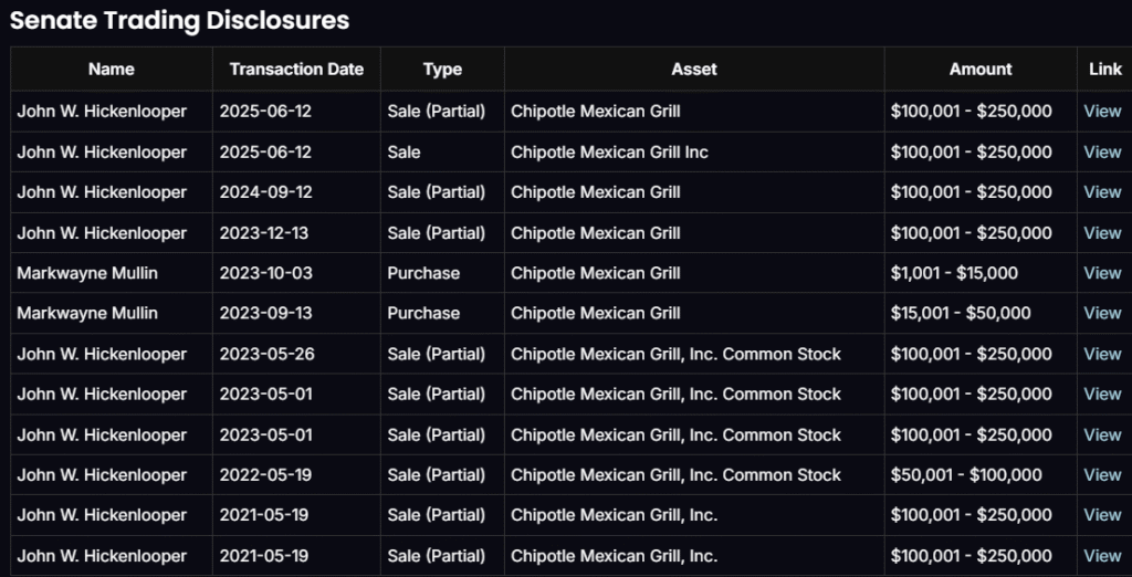 While Senator John Hickenlooper had previously trimmed his CMG holdings earlier in 2025, no new sales occurred after the correction. Notably, multiple House representatives — including Ro Khanna and Cleo Fields — purchased shares in mid-2025, near current price levels.