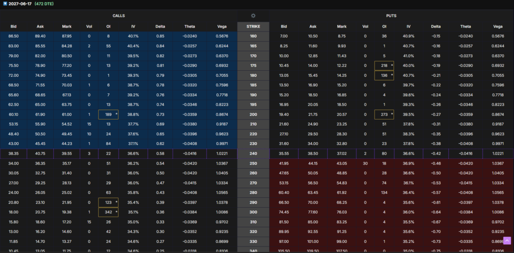Long-dated June 17, 2027 options show meaningful open interest at the $200 strike, which meets our criteria for liquidity and institutional participation.