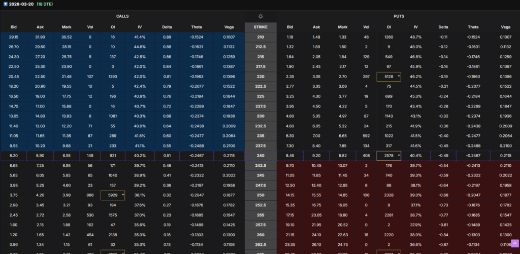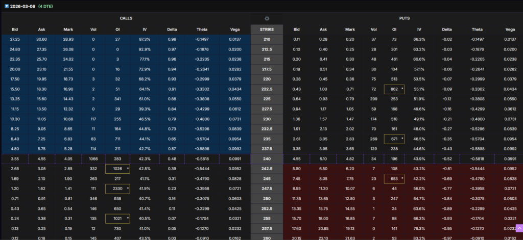 Short-dated options show heavy call open interest above current price, particularly around the $250 strike. This suggests positioning for a rebound toward the $245–250 range.