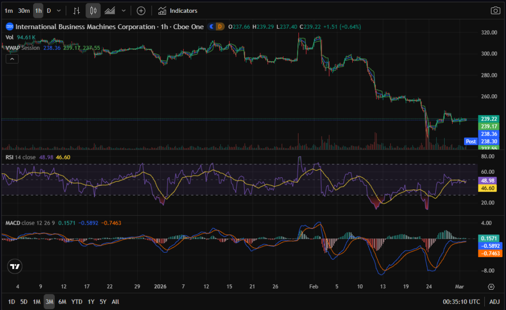 On the 3-month chart, IBM recently printed a short-term low following a roughly 20–22% pullback from the $300+ region. RSI had dipped into oversold territory and is now stabilizing near neutral. A bullish MACD crossover is beginning to form on lower timeframes, signaling early reversal potential.