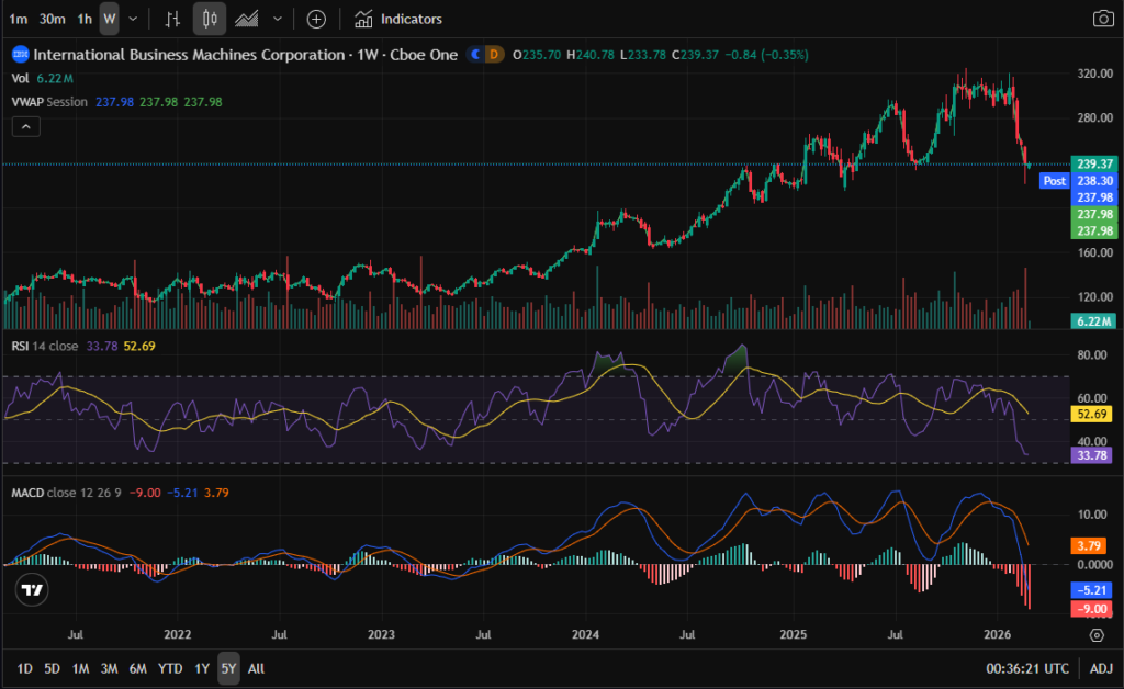 The 5-year chart shows IBM remains within a broader structural uptrend that began in 2022. The recent selloff appears to be a sharp correction within that longer-term trend rather than a structural breakdown.