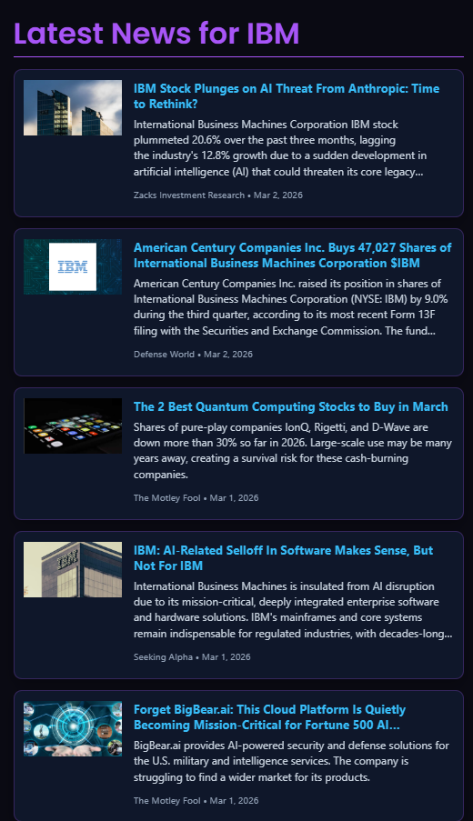 Recent headlines highlight concerns about AI disruption from companies like Anthropic. Media narratives suggest IBM could face pressure from next-generation AI competitors.