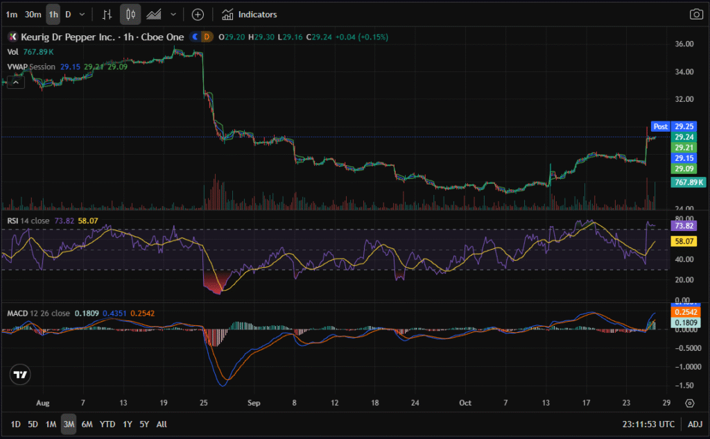 Fast forward into late October: KDP ripped back toward the high-$28s and even printed near $29.25 on the bounce. RSI on the hourly was now screaming hot (well above 70). MACD crossed bullish and pushed firmly above zero. Volume on green candles expanded. Translation? Buyers were now in control. Emotion completely flipped.