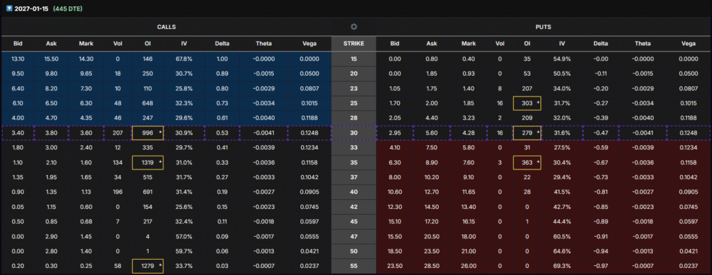 In late September, the Jan 2027 $30 calls sat around the $2 handle with open interest in the hundreds. Delta around ~0.50–0.60 told us the contract already had meaningful sensitivity to upside in the underlying. Vega was not tiny, which is exactly what we want when we’re expecting sentiment to normalize.