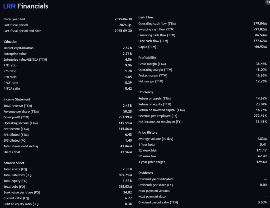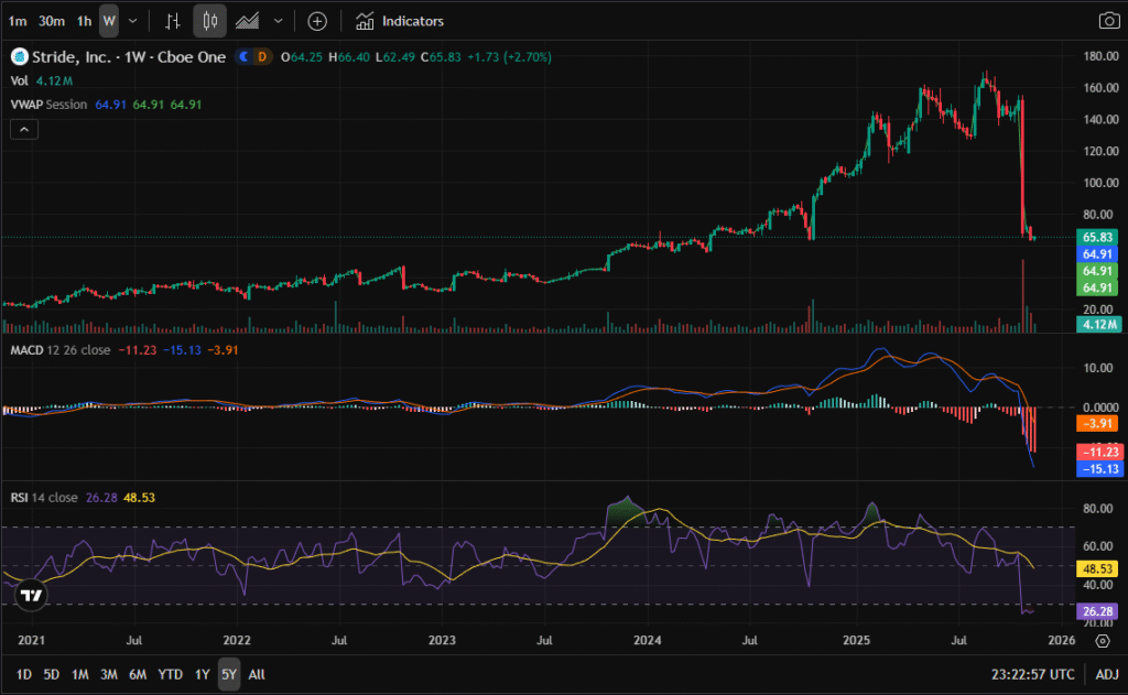 Stride, Inc. (LRN) has undergone one of the steepest and fastest collapses in its trading history — dropping from the $160s down into the mid-$60s within days. Such a collapse typically signals panic, forced selling, and institutional deleveraging. But historically, oversized collapses in fundamentally strong companies often offer high-conviction opportunities.