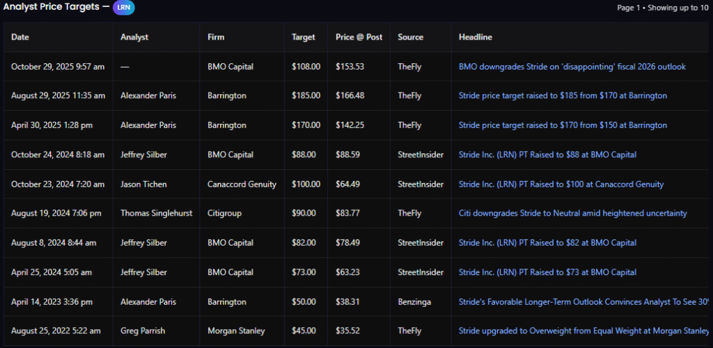 October 29, 2025 9:57 amBMO Capital$108.00$153.53TheFly BMO downgrades Stride on 'disappointing' fiscal 2026 outlook