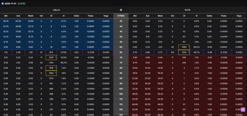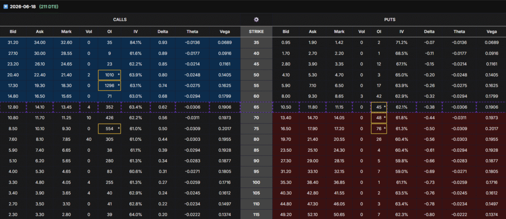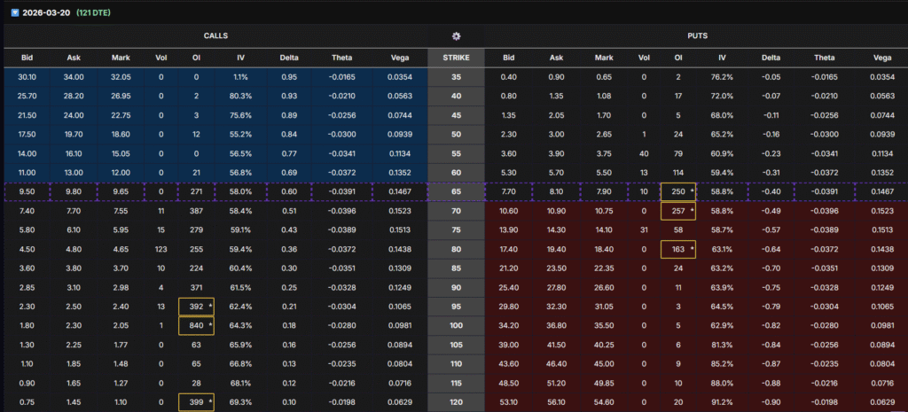 • 121-DTE expirations show OI stacked at 90, 95, 120, indicating expectations of a massive long-term rebound
