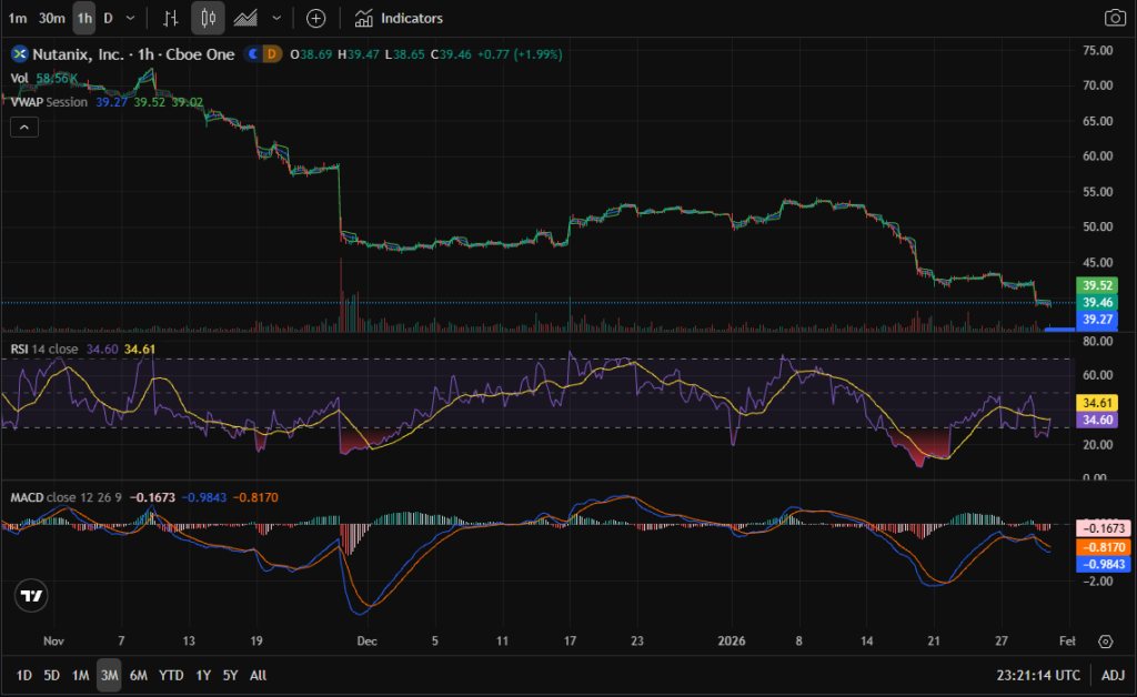 NTNX is trading near a 3-month low, with price remaining below VWAP and key moving averages. RSI sits in the low-30s—weak but no longer in free fall. MACD remains bearish, but histogram compression suggests downside momentum is decelerating rather than accelerating.