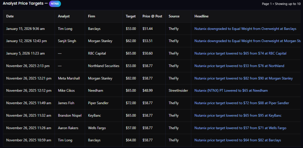Analysts broadly cut price targets following the drawdown, moving from $70–$90 ranges down to $53–$65, while downgrading ratings to Equal Weight.