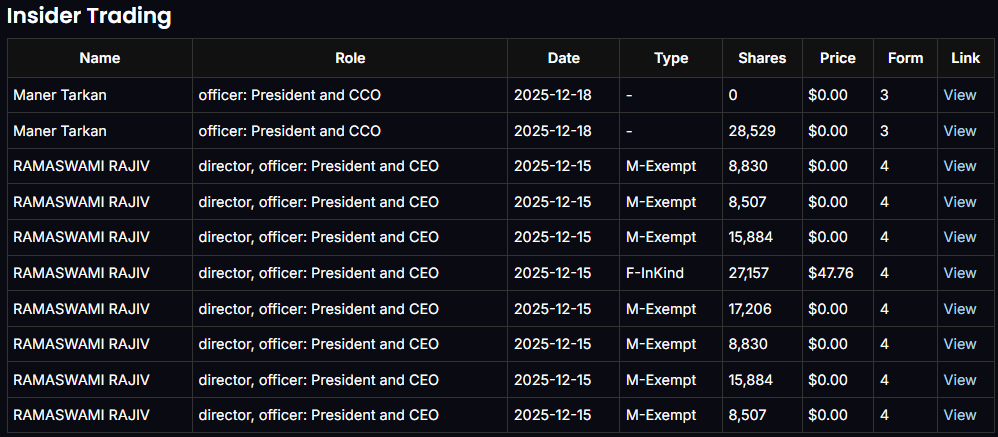 There have been no open-market insider buys, but also no panic selling. Congressional “house trades” are small, dated, and irrelevant to current price action.