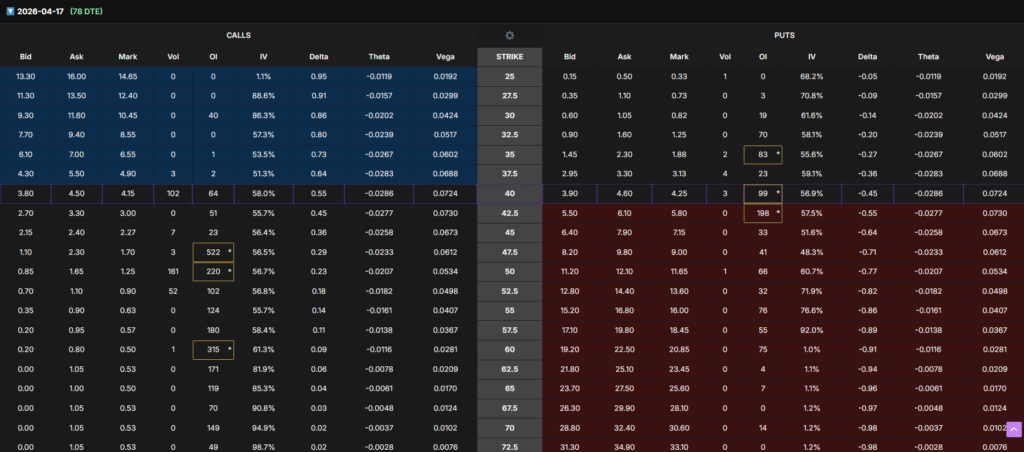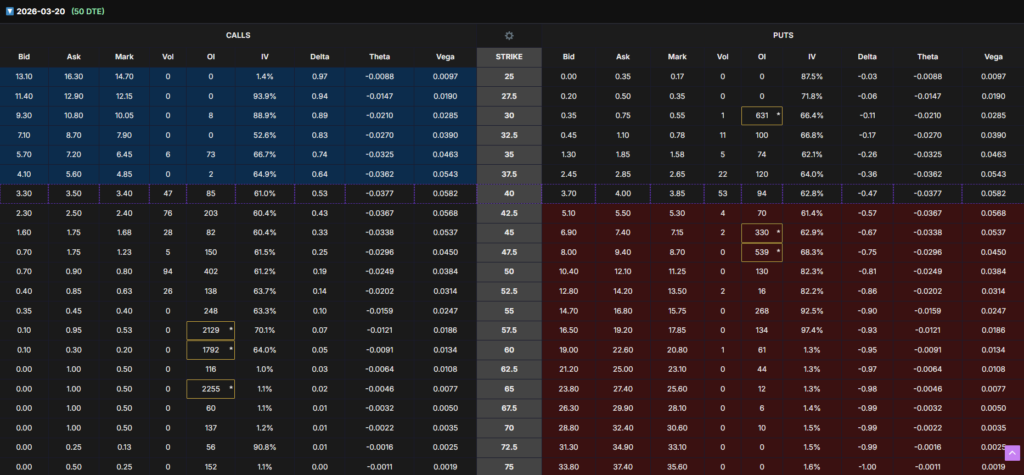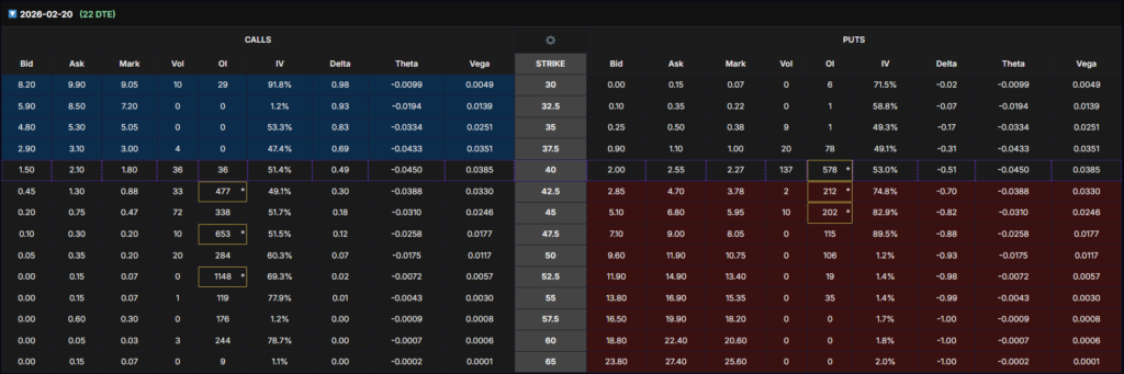 Short-dated options (22–50 DTE) show heavy put concentration near $40–45, indicating near-term caution and hedging. However, longer-dated expirations show stabilizing put pressure and selective call positioning, consistent with early mean-reversion expectations rather than aggressive bearish bets.