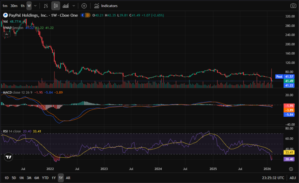 - PYPL trading near 5-year lows