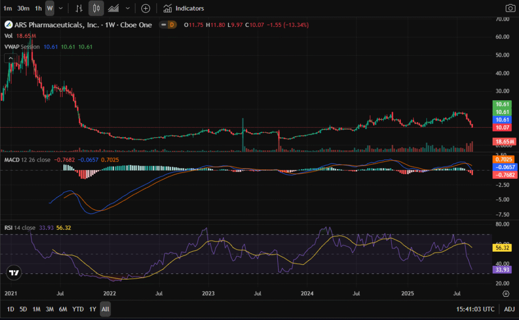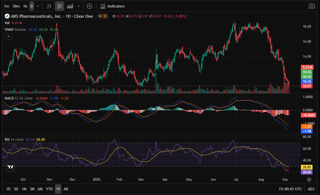 SPRY (ARS Pharmaceuticals) recently hit a 1-year low around $10.07, placing it right at the edge of the 52-week range ($9.97–$18.90). On the daily chart, the RSI sits at 20, marking an extremely oversold condition. Historically, SPRY has rebounded when RSI dipped below 30, though oversold conditions can persist in bearish phases.