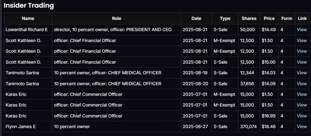 Insider activity, however, has leaned bearish. Key executives including the CEO, CFO, and CMO sold shares between $14–$18 earlier this year, with a large holder unloading nearly 370,000 shares at $18.46.