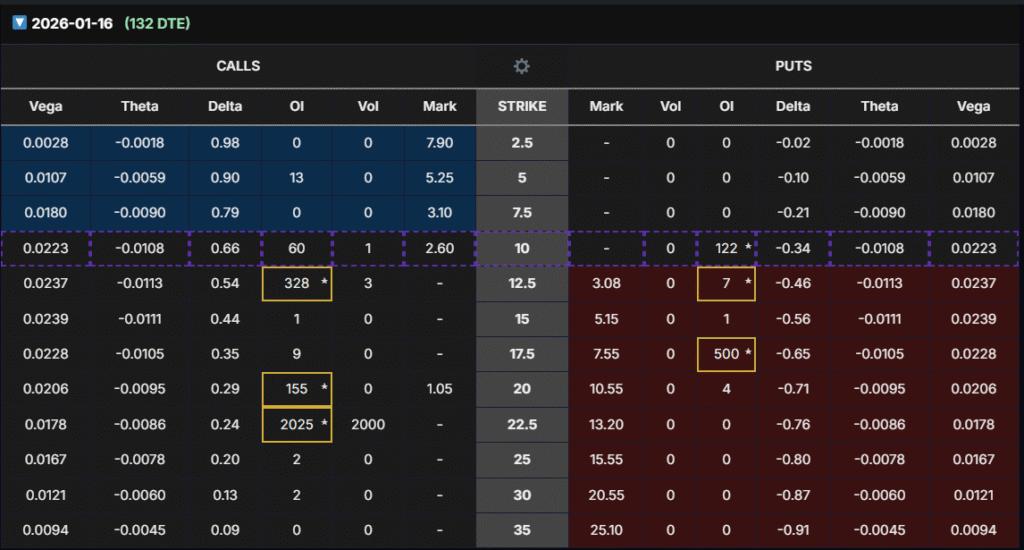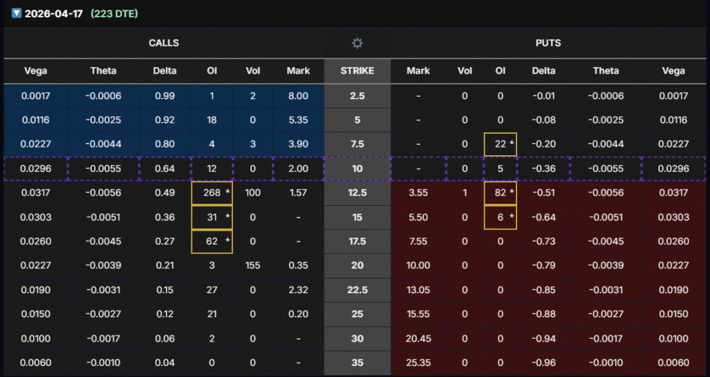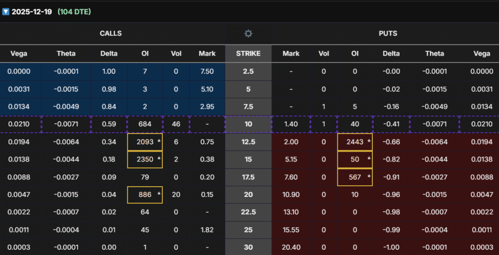 - Apr 2026 (223 DTE) expiration: Clearer bullish skew emerges. The $12.5 strike calls carry the strongest liquidity (268 OI), balanced delta (~0.49), and high Vega exposure. Put interest is much lighter, showing that traders are less focused on downside protection at this horizon.