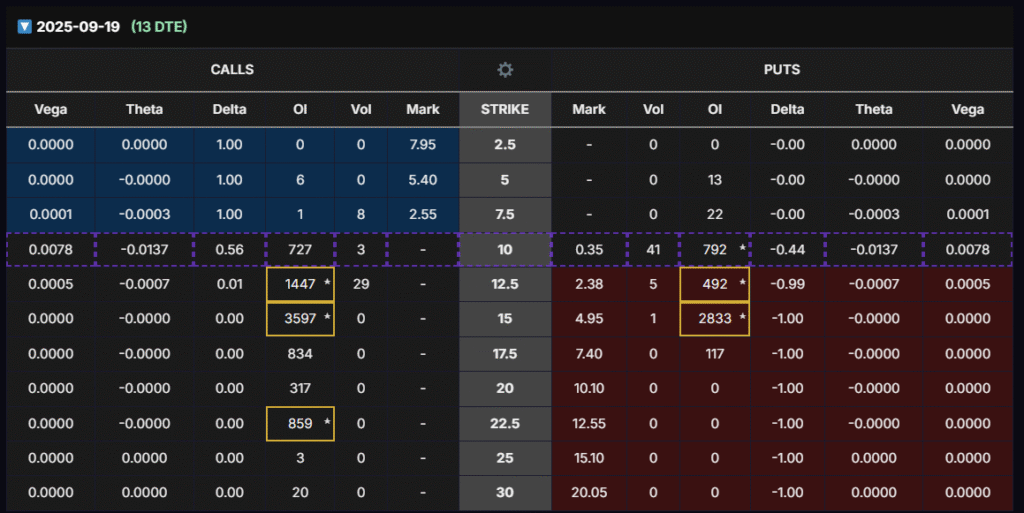 - Sept & Dec 2025 expirations: Open interest is concentrated at both $12.5–$15 calls and $12.5–$15 puts, reflecting hedged strategies (likely straddles/strangles) around volatility events. This positioning suggests traders are bracing for movement but not yet committed to a directional bet.