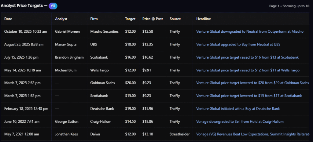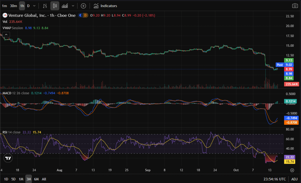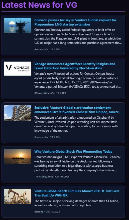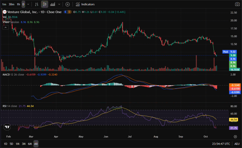 Venture Global (VG) has suffered one of its sharpest drawdowns of 2025, falling from highs near $17.50 to around the $9 zone — a decline exceeding 45%. This selloff was driven by a sequence of arbitration losses and legal headlines involving BP, Chevron, and Unipec (Sinopec subsidiary).