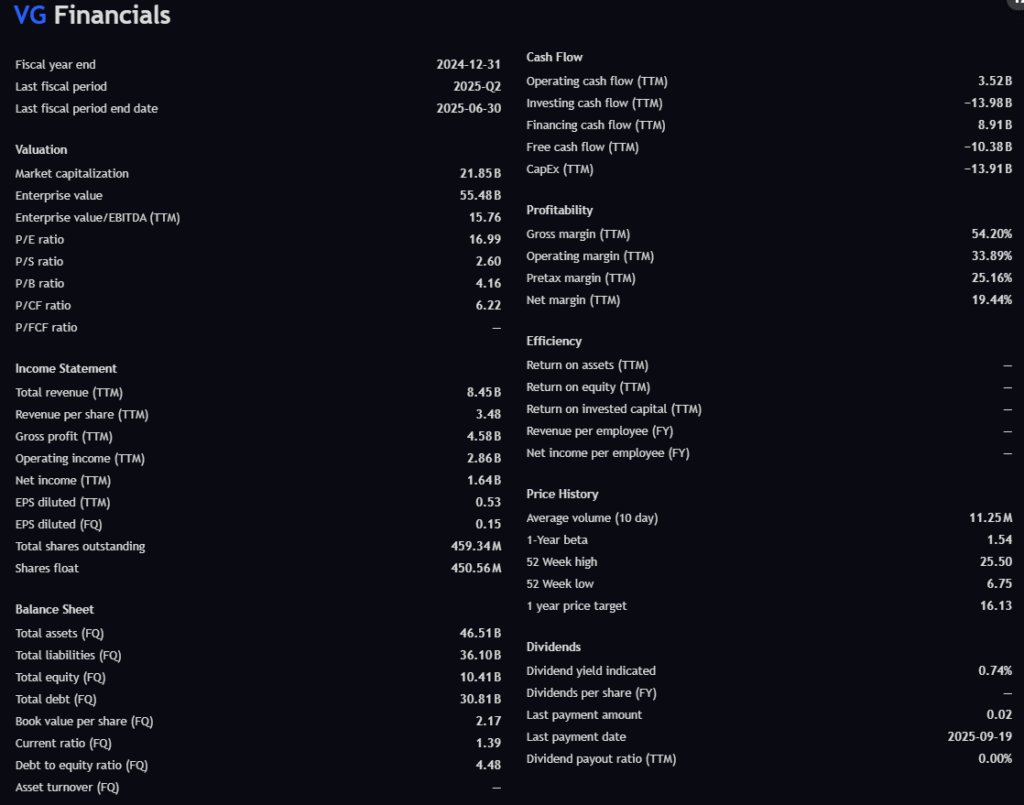 A 10–15% move in VG’s price (~$9 → $10.50–$11) could produce a 3–5× percentage move in the option. - Combined Effect: