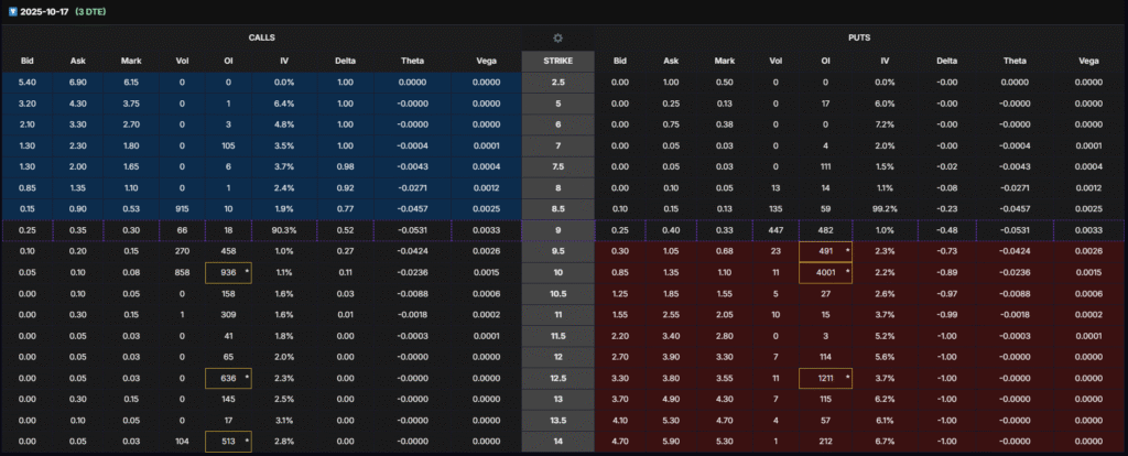 - Oct 17, 2025 (3 DTE): Bearish hedging; puts dominate near $9–$10.